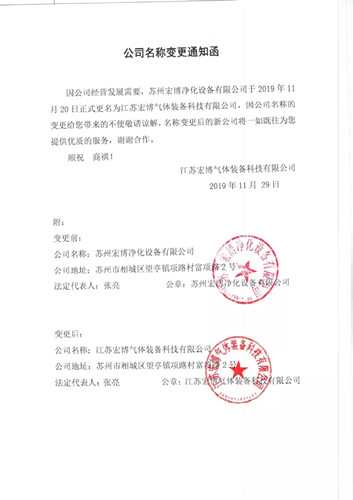 為適應(yīng)市場(chǎng)經(jīng)營(yíng)和公司發(fā)展需要,2019年11月20日,經(jīng)蘇州市相城區(qū)行政審批局核準(zhǔn),原“蘇州宏博凈化設(shè)備有限公司”正式變更登記為“江蘇宏博氣體裝備科技有限公司”。