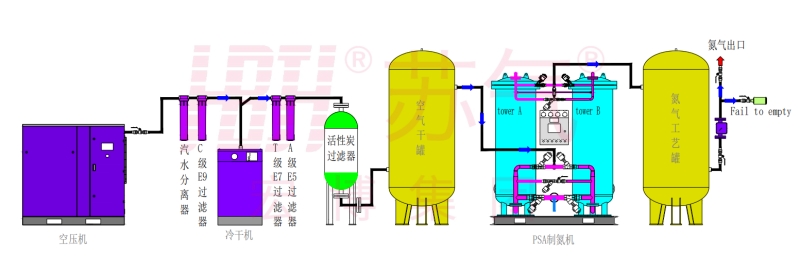 環(huán)境空氣經(jīng)壓縮凈化,除去油、水、塵后,進(jìn)入由兩個(gè)裝填有碳分子篩的吸附塔組成的變壓吸附裝置。壓縮空氣由下至上流經(jīng)吸附 塔,其間氧分子在碳分子篩表面吸附,氮?dú)庥晌剿隙肆鞒?,進(jìn)入粗氮緩沖罐,經(jīng)過一段時(shí)間后,吸附塔中碳分子篩被吸附的氧飽和,需進(jìn)行再生。再生是通過停止吸附步驟,降低吸附塔壓力來實(shí)現(xiàn)的。兩個(gè)吸附塔交替進(jìn)行吸附和再生,從而確保氮?dú)獾倪B續(xù)輸出。