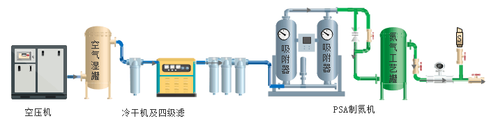 空壓機(jī)→空氣緩沖罐(濕罐)→C級過濾器→冷凍式干燥機(jī)→T級過濾器→A級過濾器→H級過濾器→制氮機(jī)主機(jī)→氮?dú)饬髁?,純度,壓力檢測→氮?dú)鈨夤蕖褂命c(diǎn)